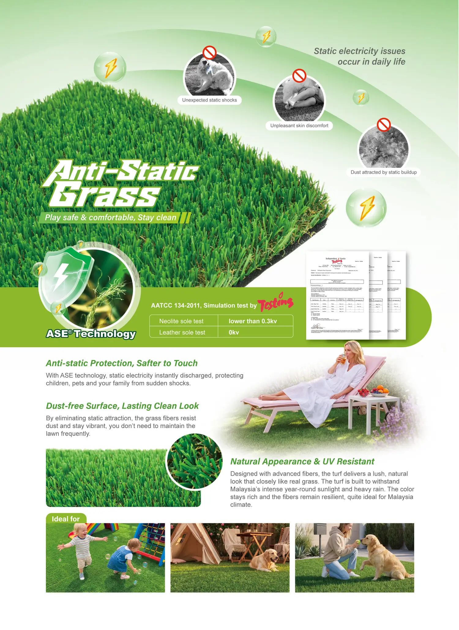 Polyethylene (PE) has a soft yet strong texture which gives comfort with durability and no traces of chemical residue like lead contents in it. This makes it safe for adults, children and even pets to relax and enjoy the beauty of the artificial grass.